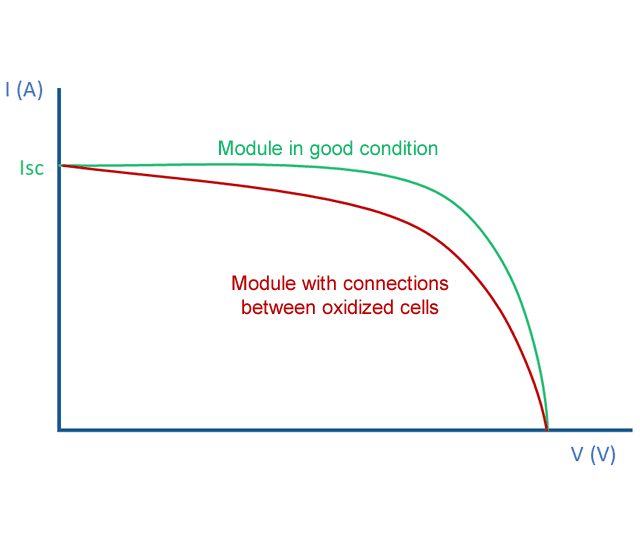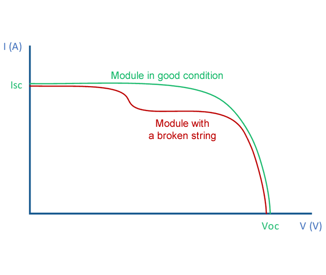 IV Curves are characteristic to each of the solar photovoltaic module. We need to measure them to know in an unequivocal way in what situation each of the modules is and be able to proceed in case a problem arises. The IV Curves that we offer in our platform are differential from our competitors. While other strategies are based on indirect methods, we face the problem straight away. Here are typical IV Curves with their meaning so that they can be easily understood: